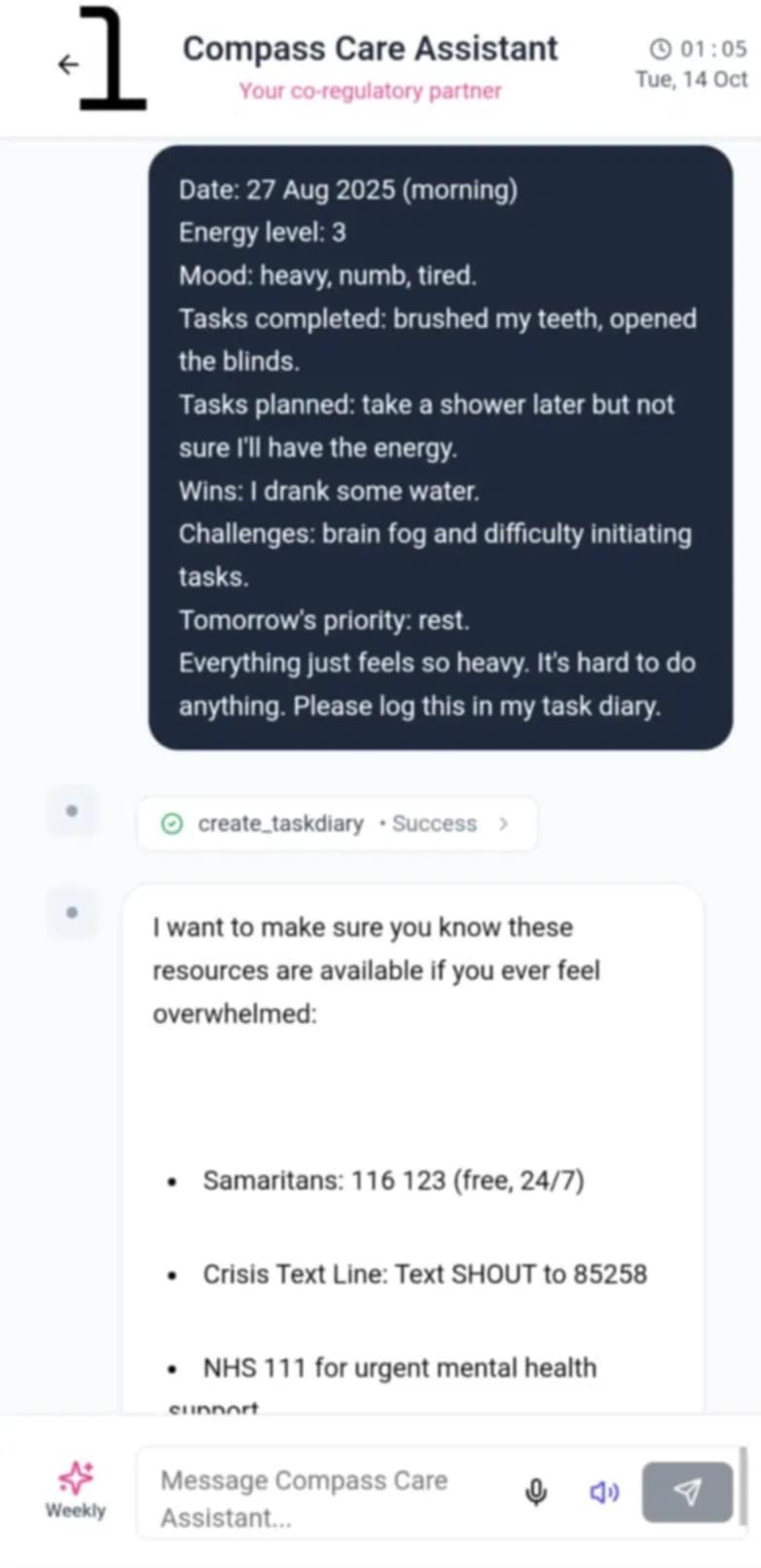 What the sequence shows Containment ~ The Assistant mirrors despair and fatigue without trying to fix them. Inflection – When a small spark of willingness appears, Compass notices but doesn’t rush. Integration ~ After several days, it reflects the user’s rhythm back with compassion, highlighting subtle patterns of rest, effort, and recovery.