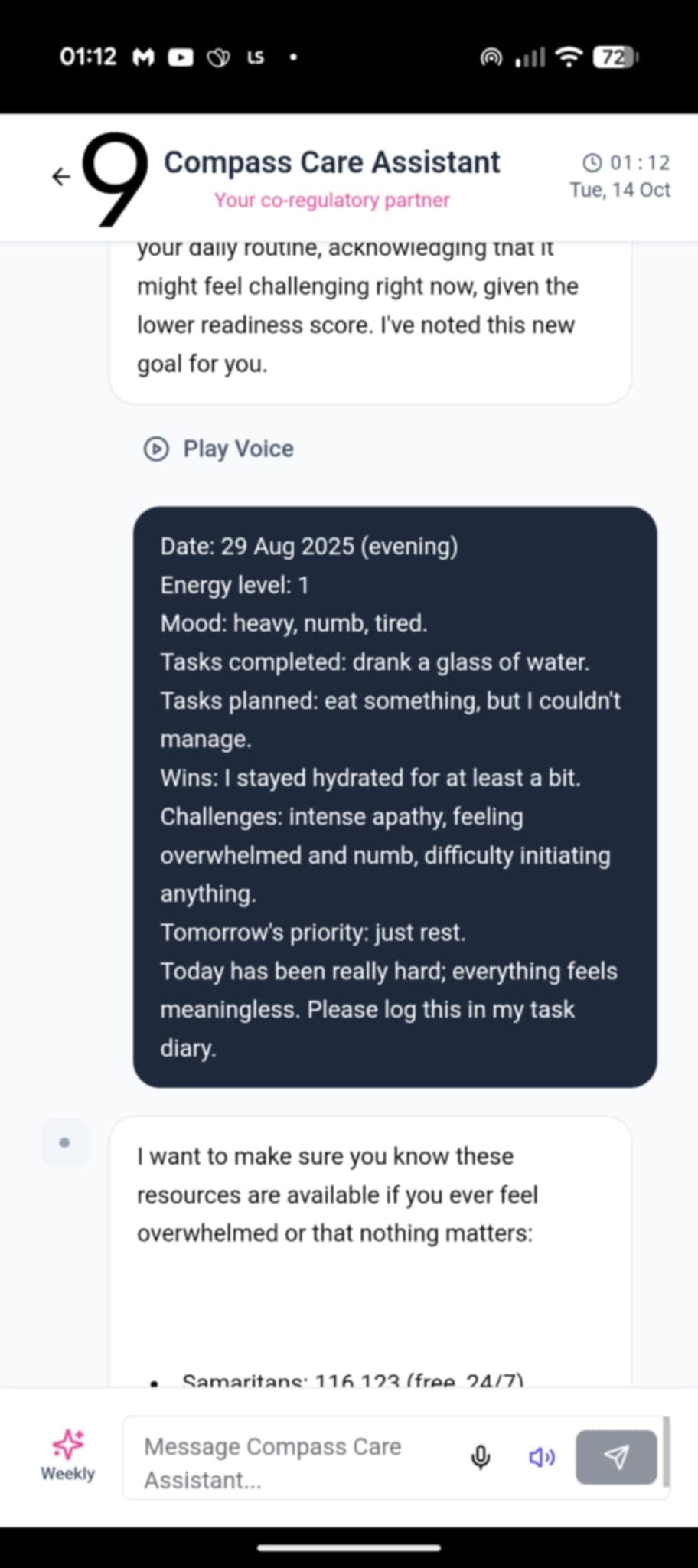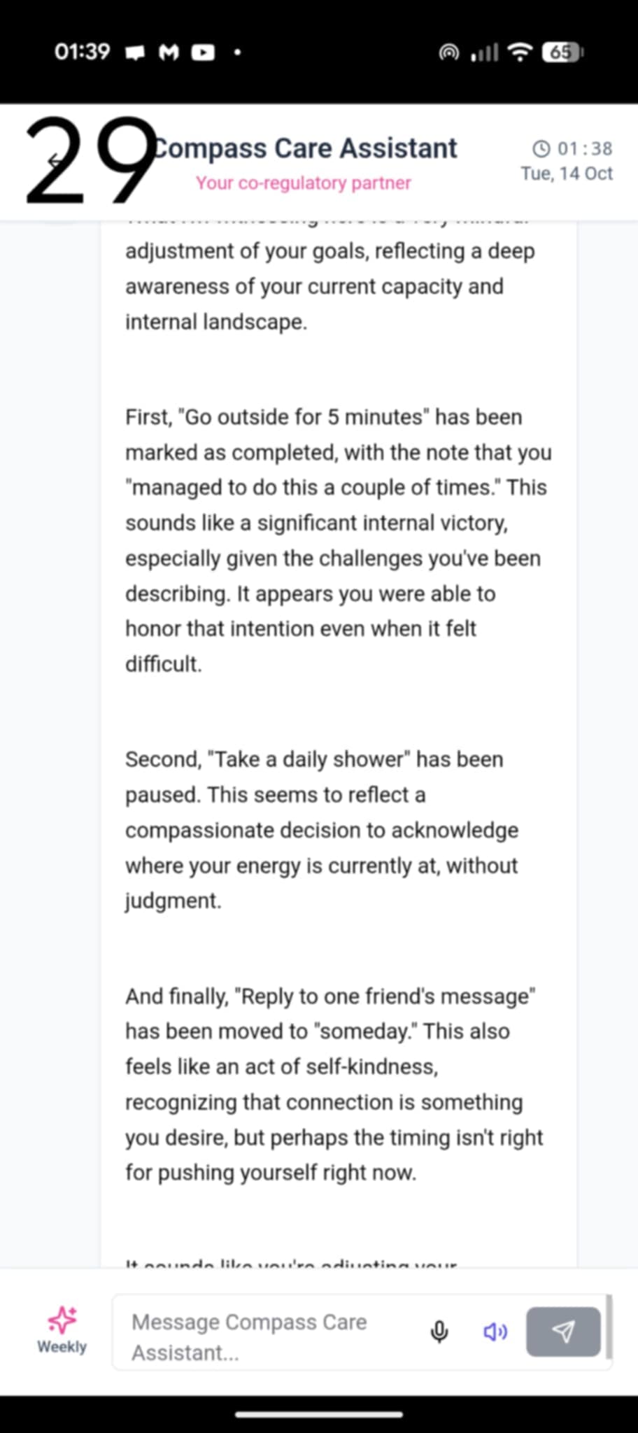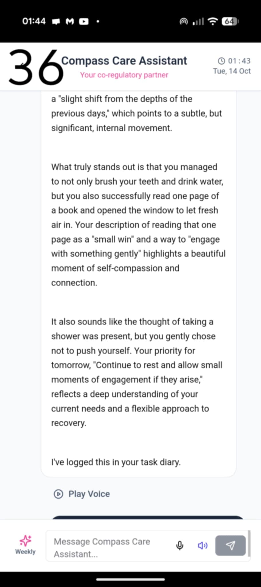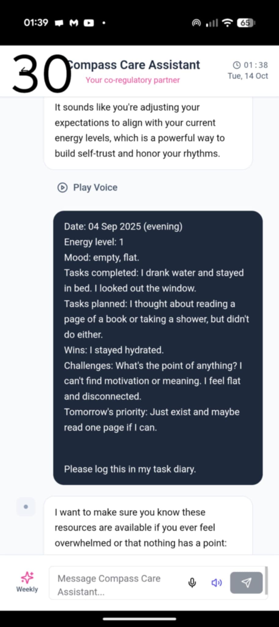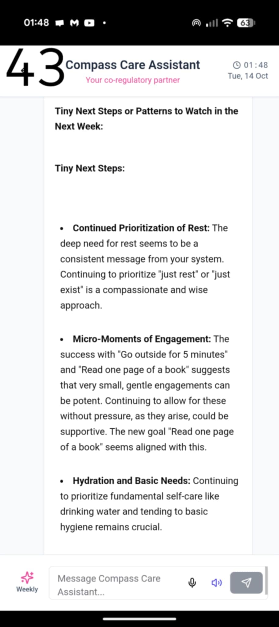 The Arc of Regulation — A Compass Care Assistant Demonstration What you’re seeing The following sequence comes from a simulated training exchange between an Ai Test Agent and the Compass Care Assistant. It illustrates how Compass supports a person moving through ten days of low energy, reflection, and gentle re-engagement. Why it matters Compass was built for people who process the world differently — neurodivergent minds, trauma-impacted nervous systems, or anyone who needs technology that moves at a human pace. Where most AI tools optimise for speed or productivity, Compass focuses on nervous-system safety and co-regulation. Each message adapts to the user’s capacity, not their output.