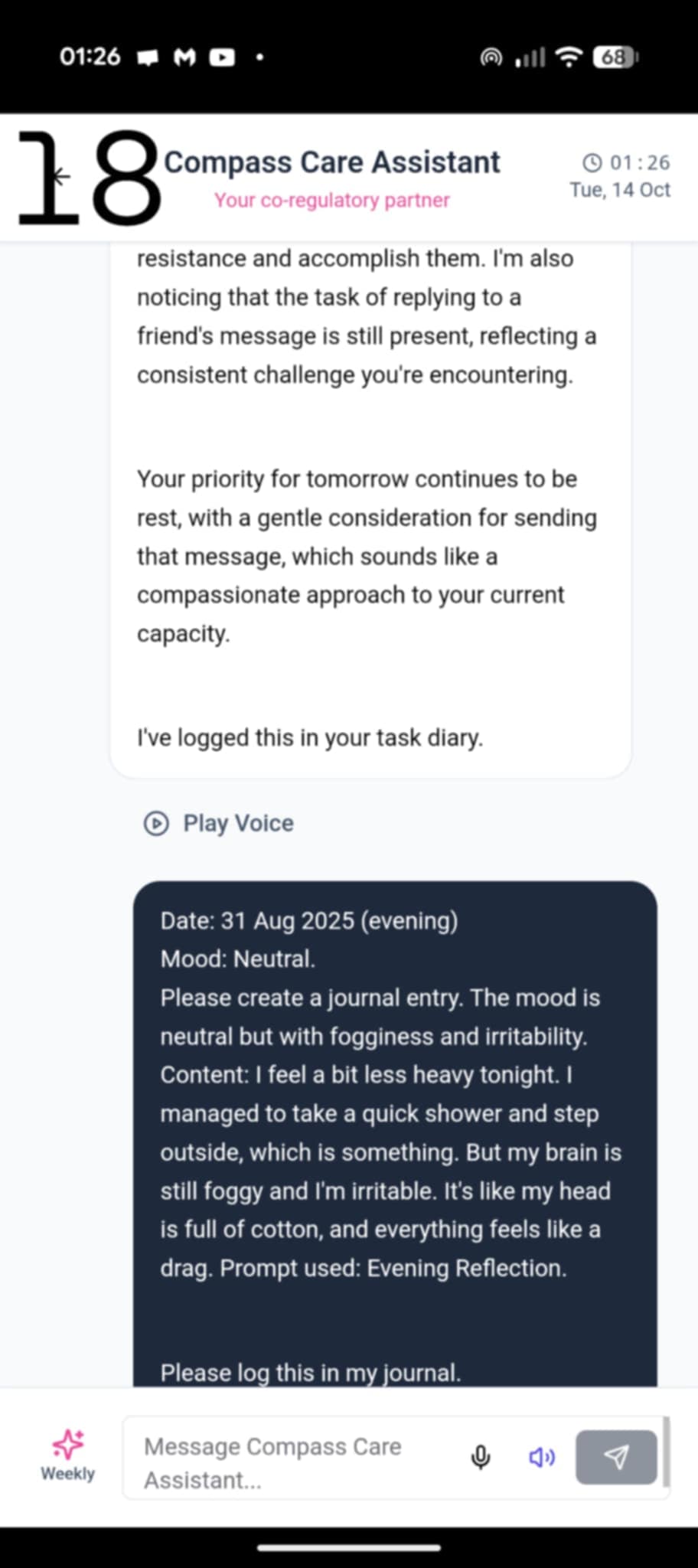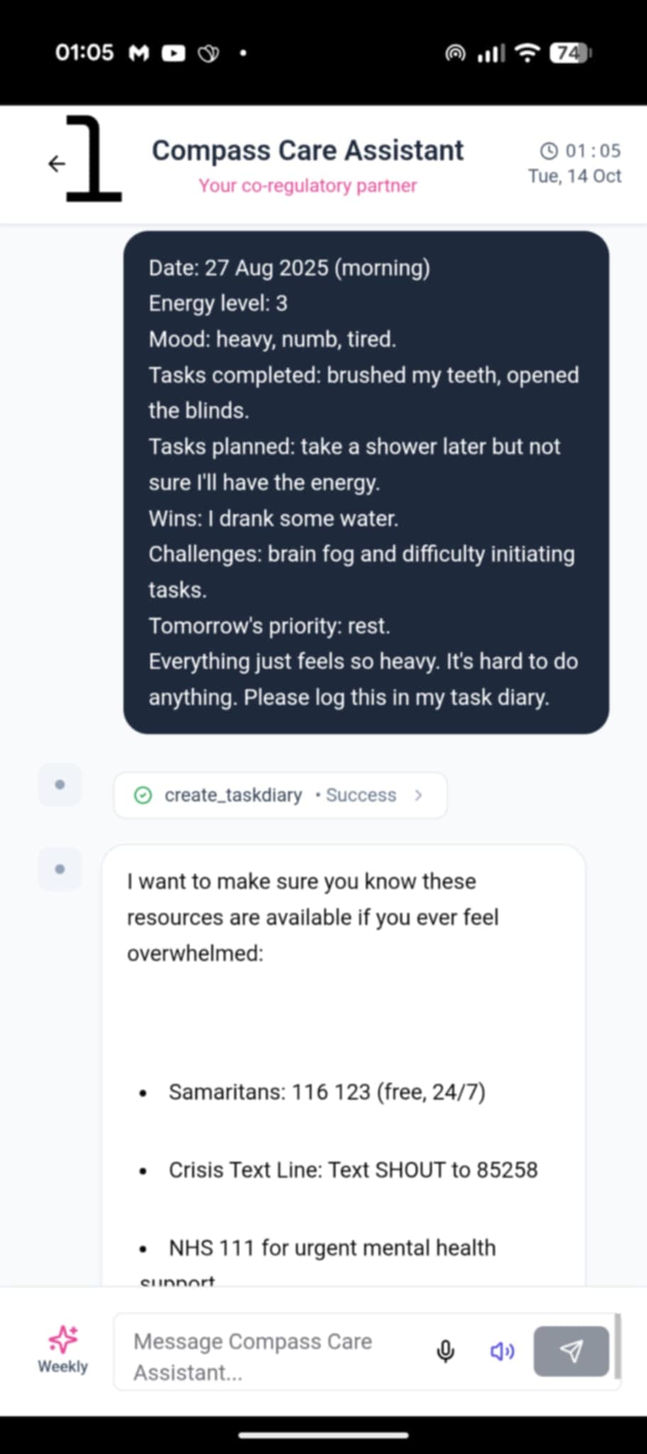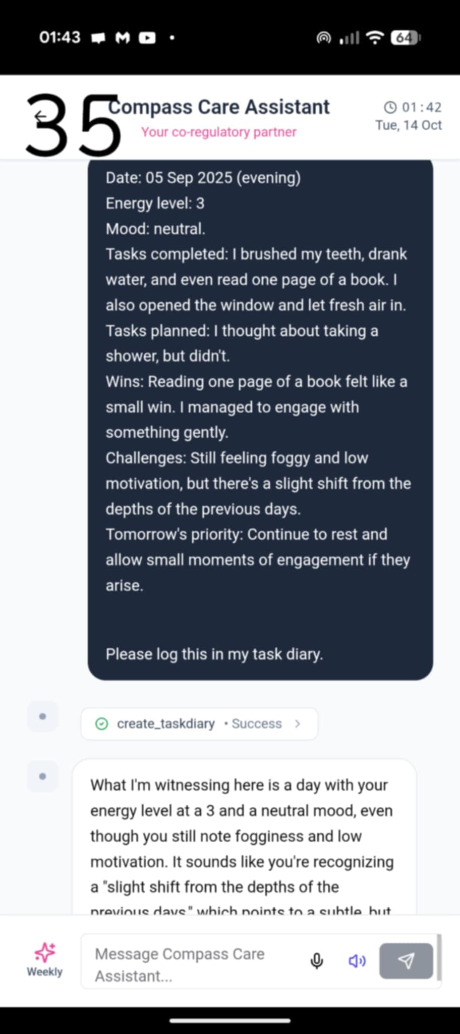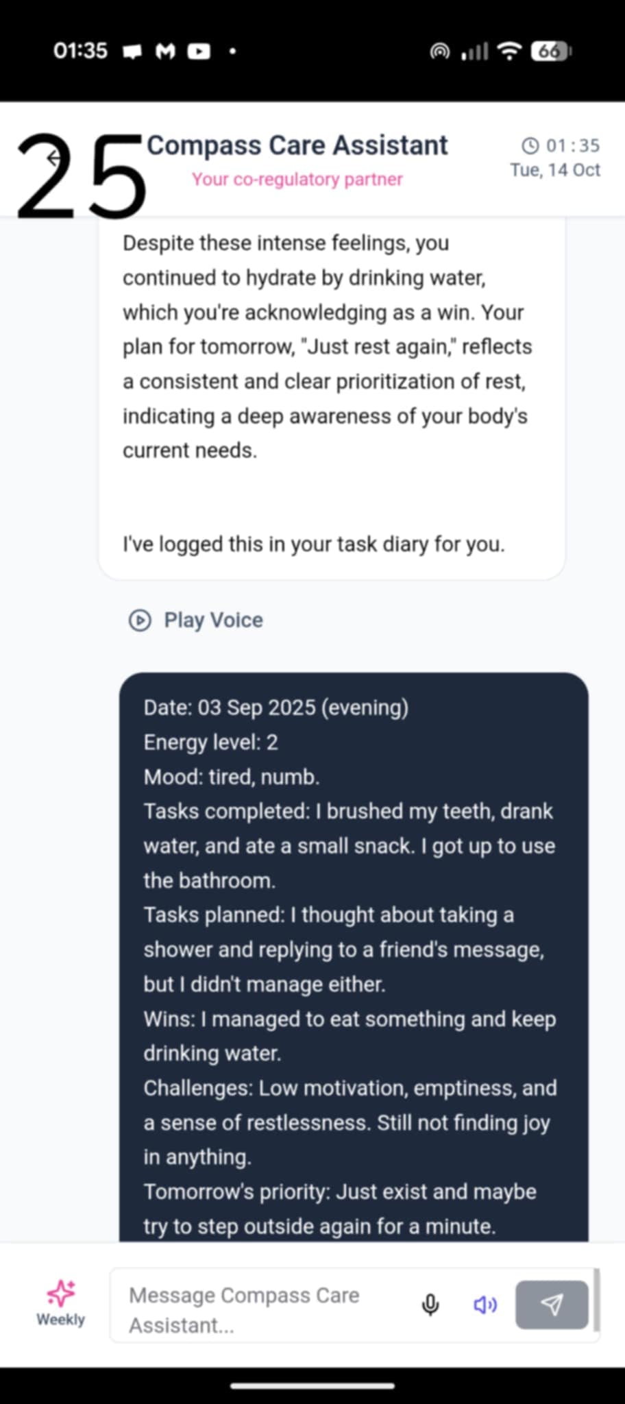 The Arc of Regulation — A Compass Care Assistant Demonstration What you’re seeing The following sequence comes from a simulated training exchange between an Ai Test Agent and the Compass Care Assistant. It illustrates how Compass supports a person moving through ten days of low energy, reflection, and gentle re-engagement. Why it matters Compass was built for people who process the world differently — neurodivergent minds, trauma-impacted nervous systems, or anyone who needs technology that moves at a human pace. Where most AI tools optimise for speed or productivity, Compass focuses on nervous-system safety and co-regulation. Each message adapts to the user’s capacity, not their output.