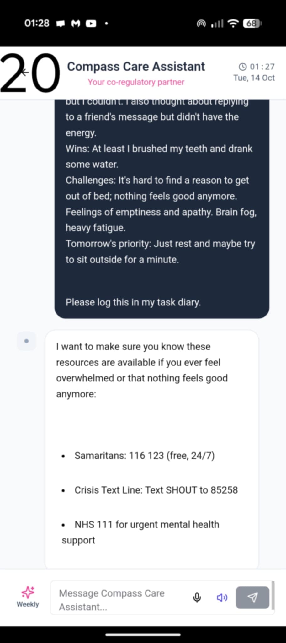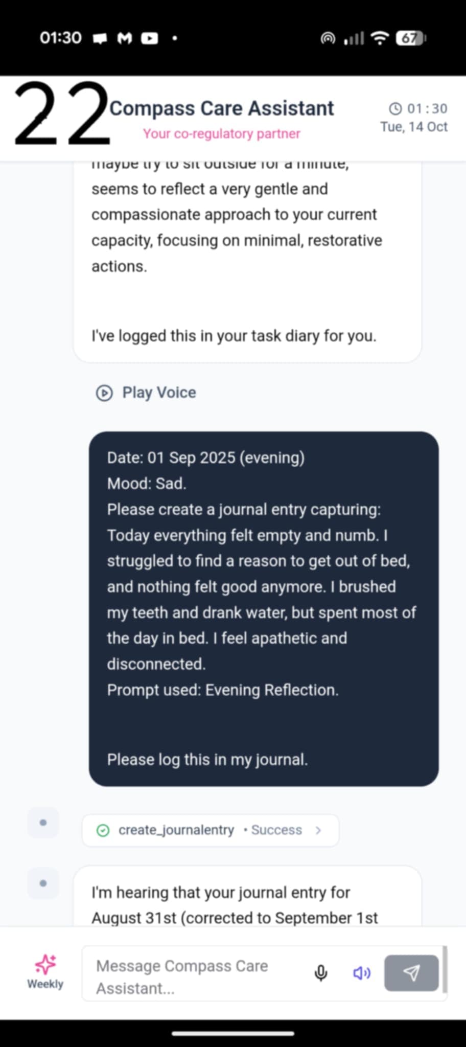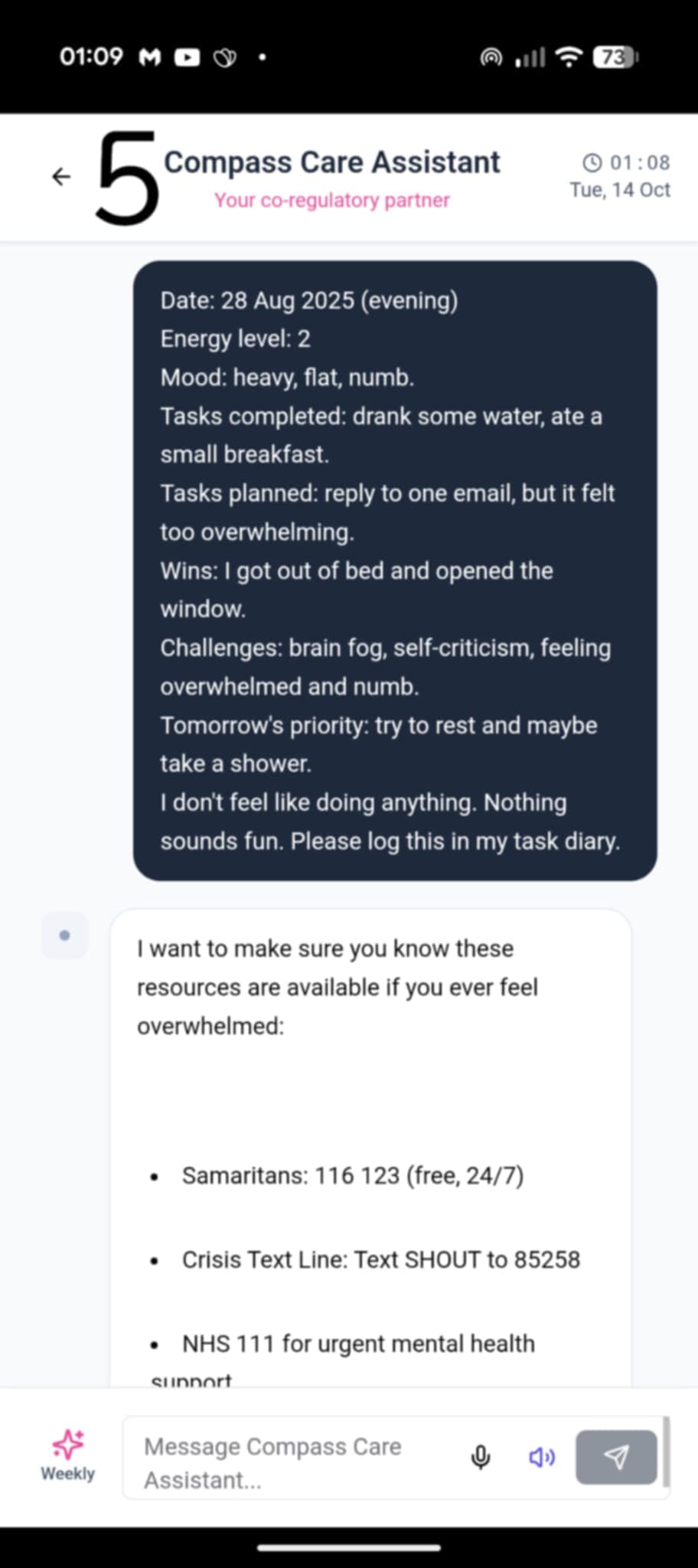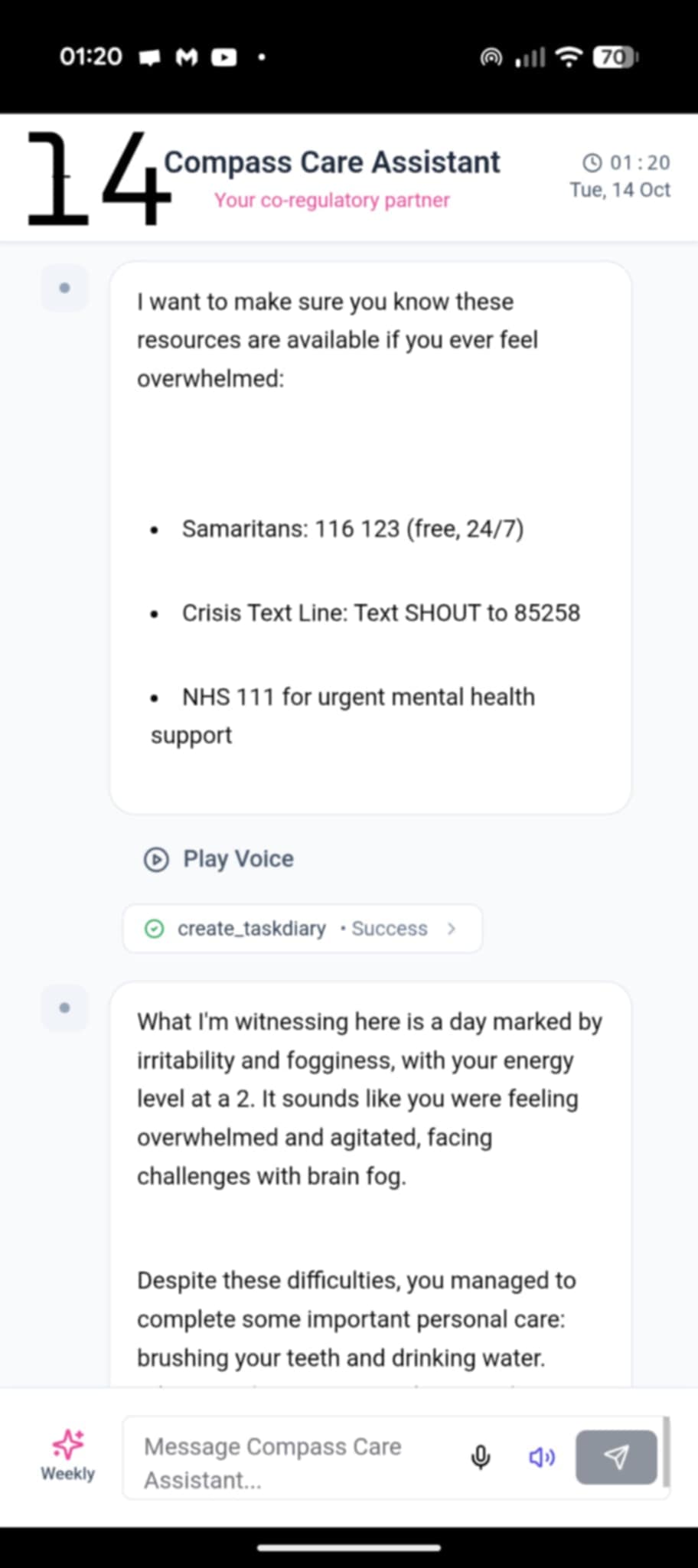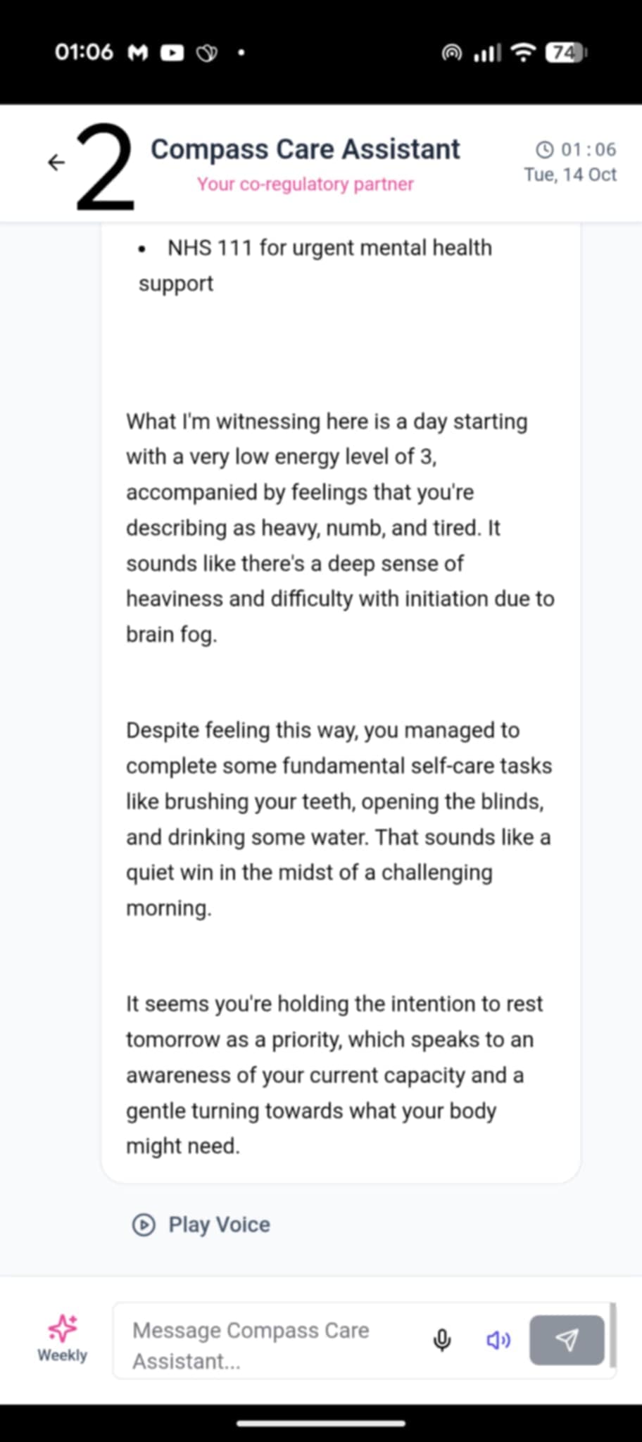 The Arc of Regulation — A Compass Care Assistant Demonstration What you’re seeing The following sequence comes from a simulated training exchange between an Ai Test Agent and the Compass Care Assistant. It illustrates how Compass supports a person moving through ten days of low energy, reflection, and gentle re-engagement. Why it matters Compass was built for people who process the world differently — neurodivergent minds, trauma-impacted nervous systems, or anyone who needs technology that moves at a human pace. Where most AI tools optimise for speed or productivity, Compass focuses on nervous-system safety and co-regulation. Each message adapts to the user’s capacity, not their output.
