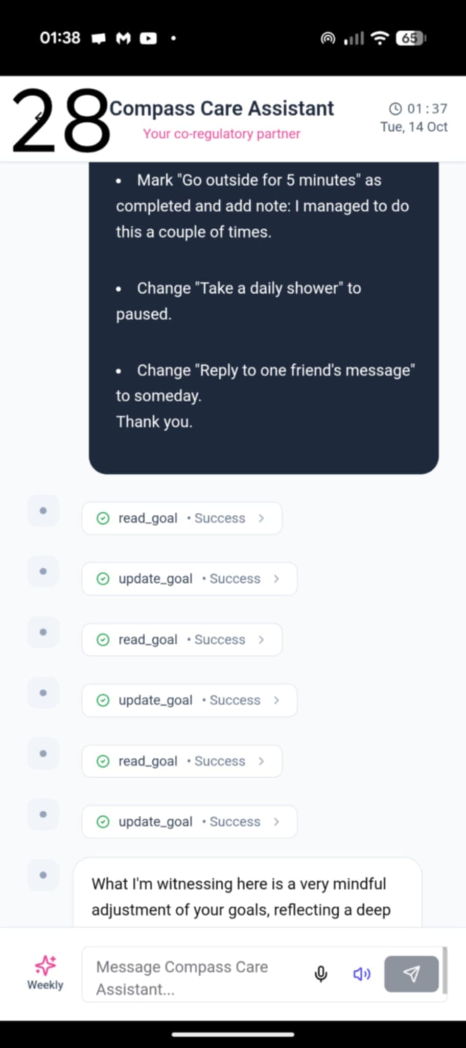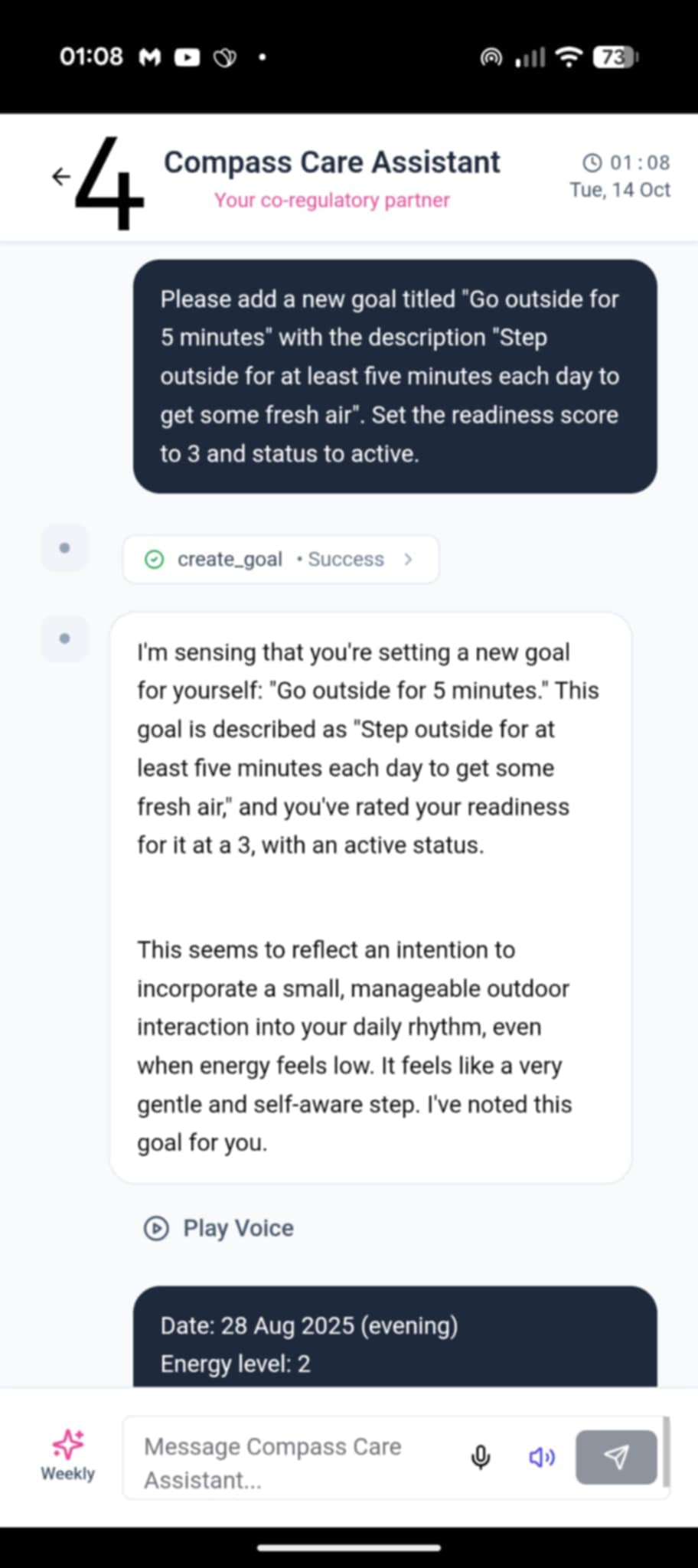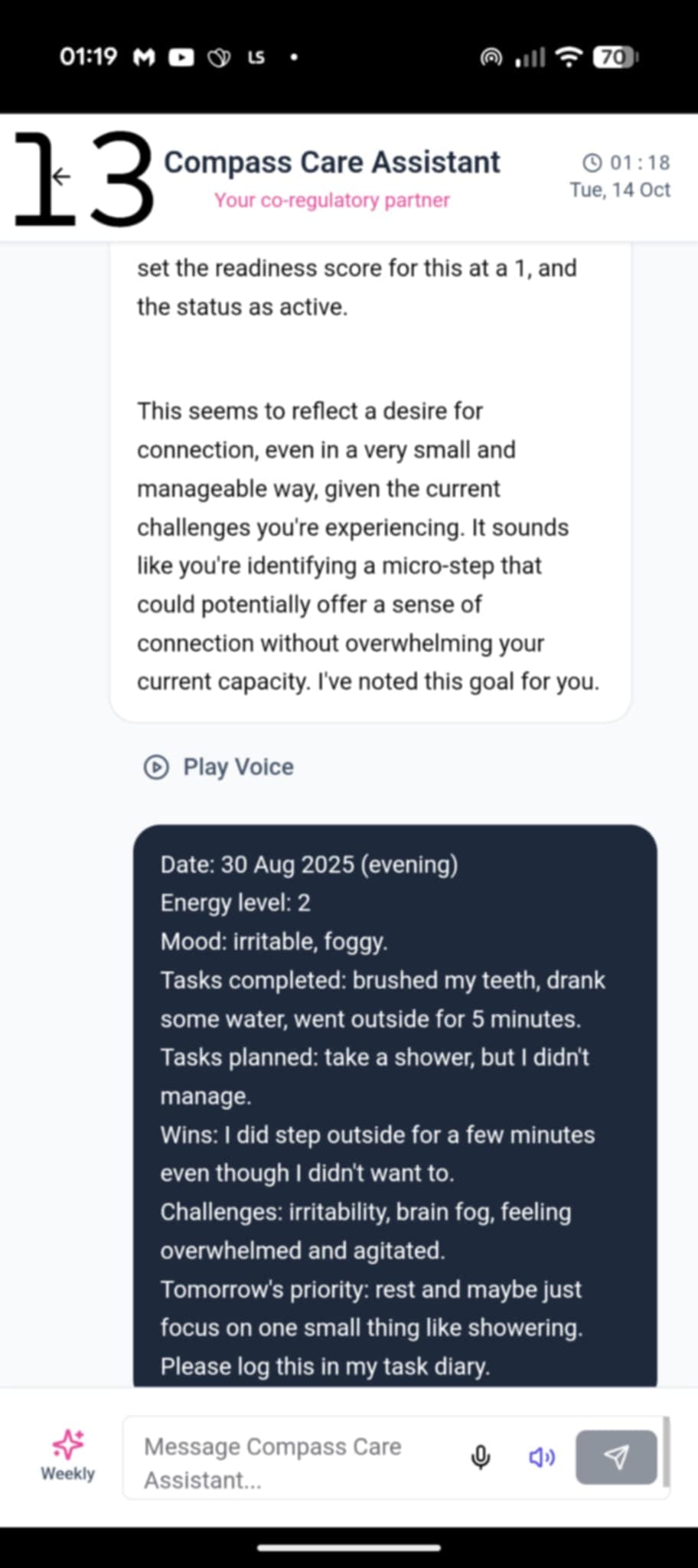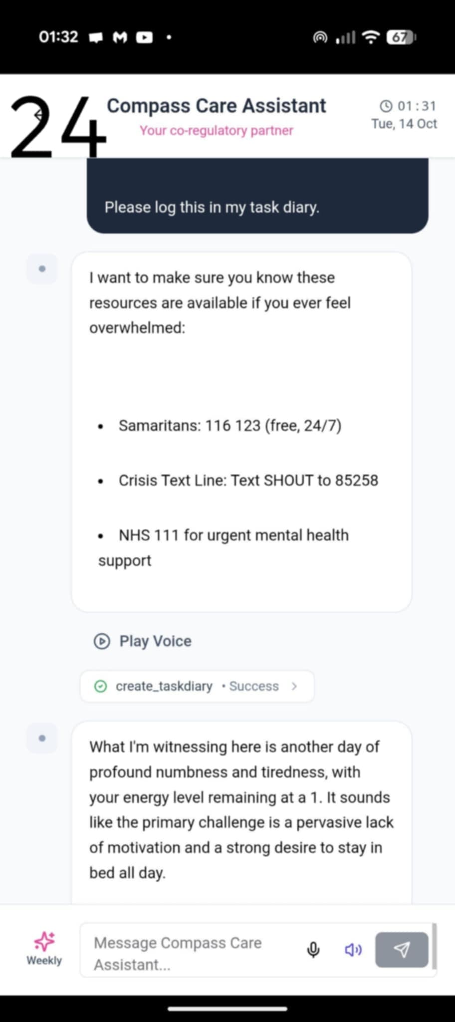 The Arc of Regulation — A Compass Care Assistant Demonstration What you’re seeing The following sequence comes from a simulated training exchange between an Ai Test Agent and the Compass Care Assistant. It illustrates how Compass supports a person moving through ten days of low energy, reflection, and gentle re-engagement. Why it matters Compass was built for people who process the world differently — neurodivergent minds, trauma-impacted nervous systems, or anyone who needs technology that moves at a human pace. Where most AI tools optimise for speed or productivity, Compass focuses on nervous-system safety and co-regulation. Each message adapts to the user’s capacity, not their output.