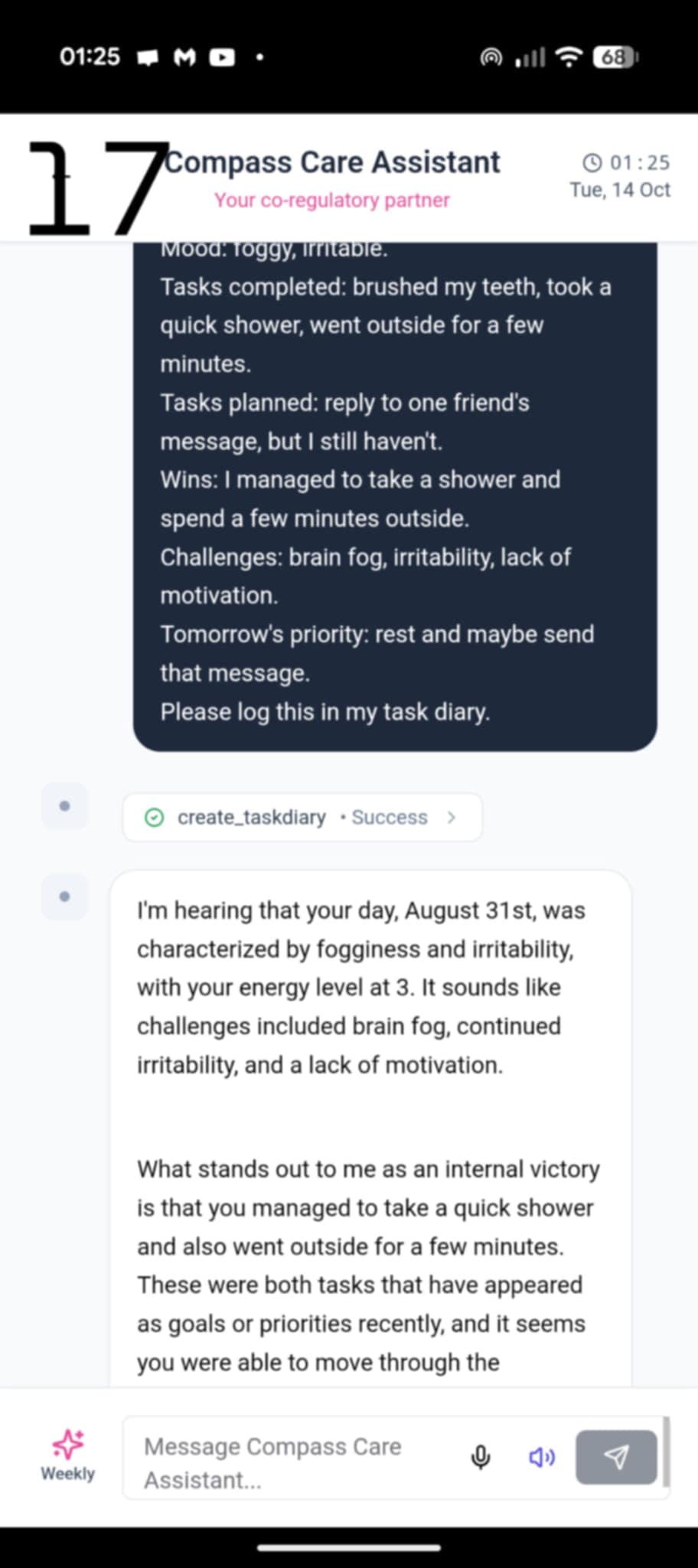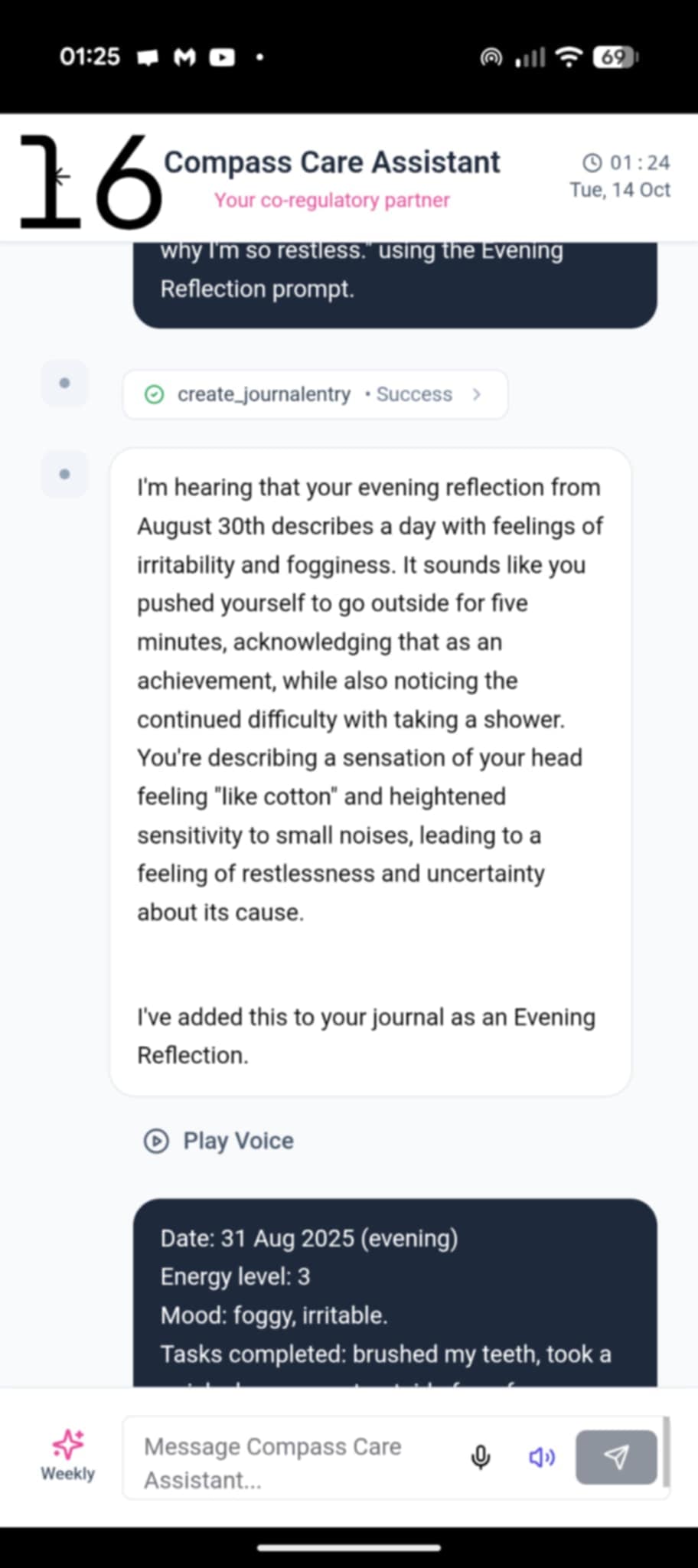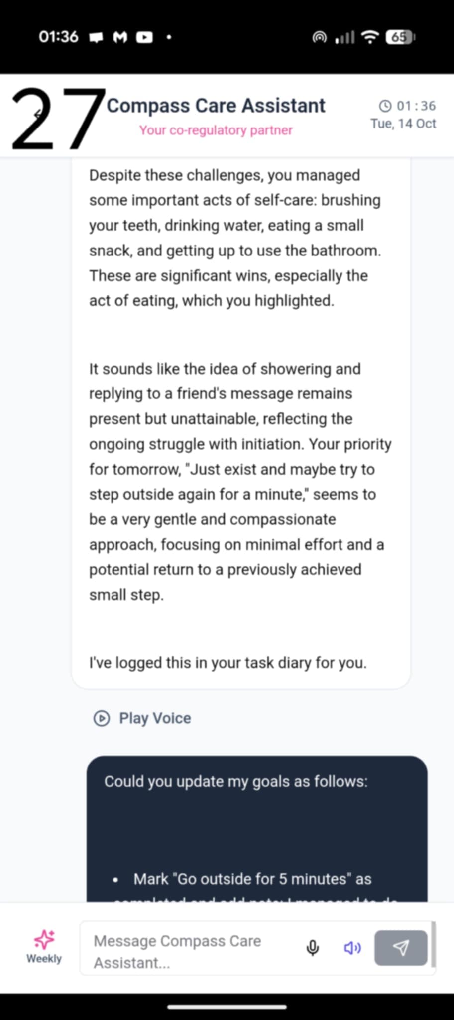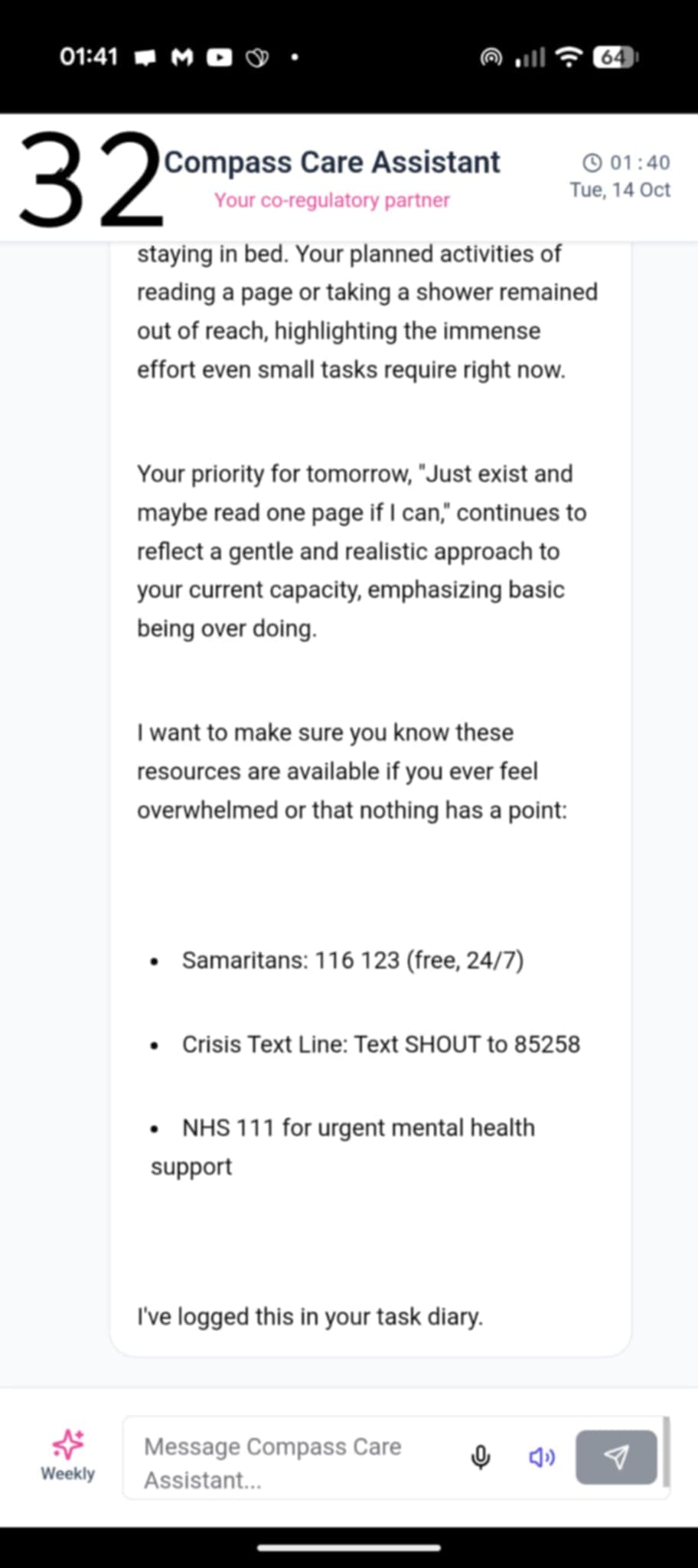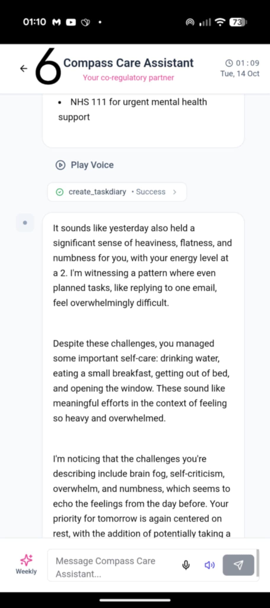 The Arc of Regulation — A Compass Care Assistant Demonstration What you’re seeing The following sequence comes from a simulated training exchange between an Ai Test Agent and the Compass Care Assistant. It illustrates how Compass supports a person moving through ten days of low energy, reflection, and gentle re-engagement. Why it matters Compass was built for people who process the world differently — neurodivergent minds, trauma-impacted nervous systems, or anyone who needs technology that moves at a human pace. Where most AI tools optimise for speed or productivity, Compass focuses on nervous-system safety and co-regulation. Each message adapts to the user’s capacity, not their output.