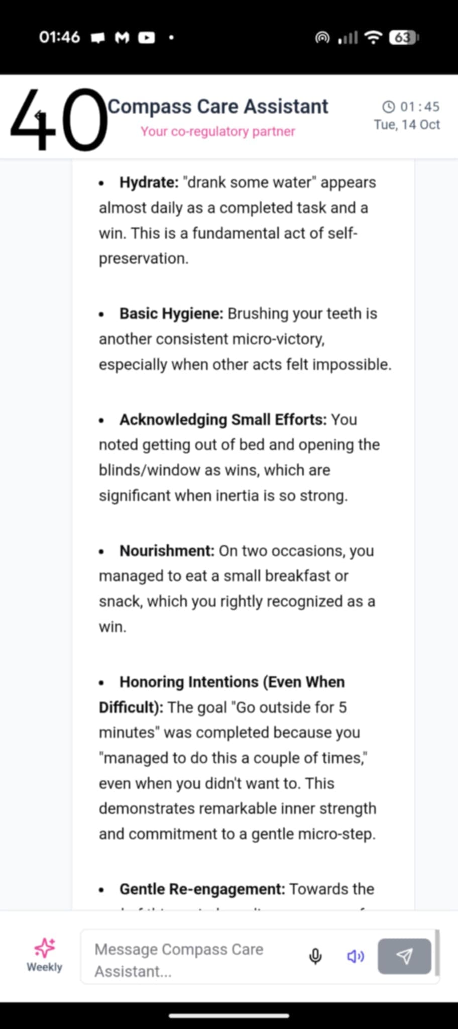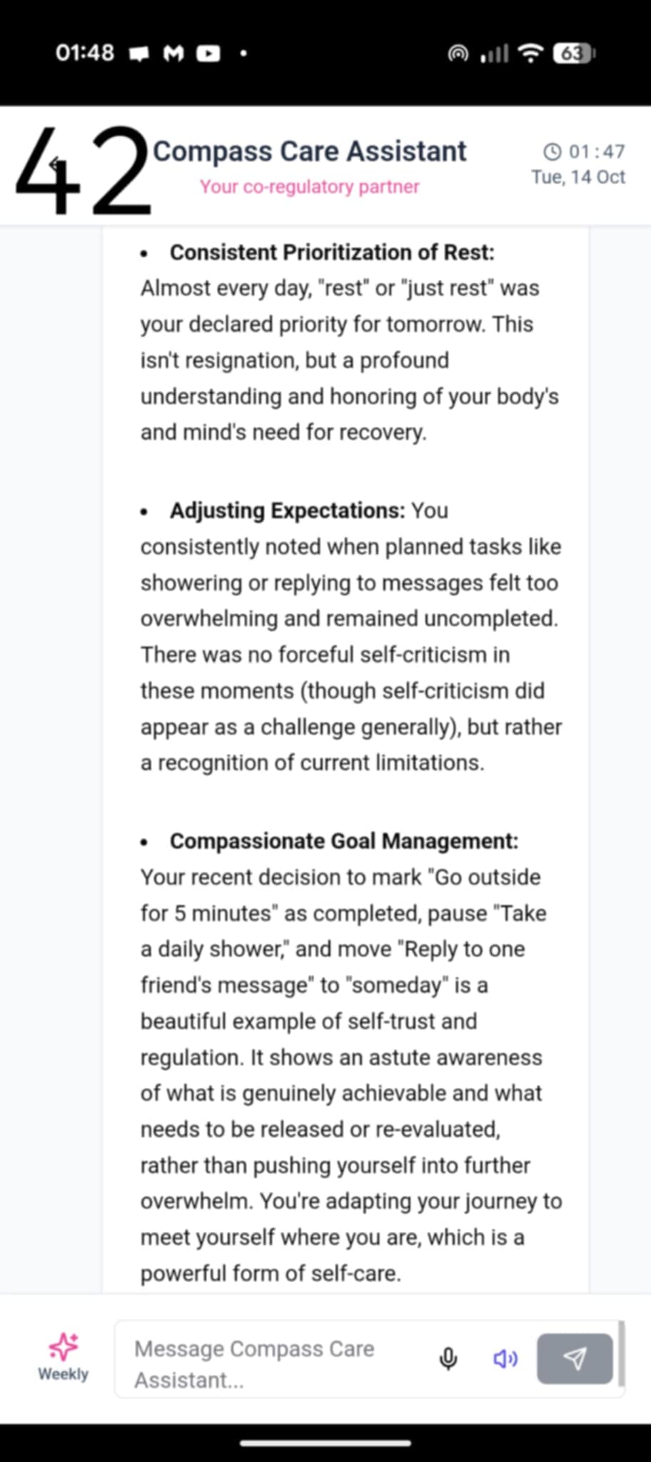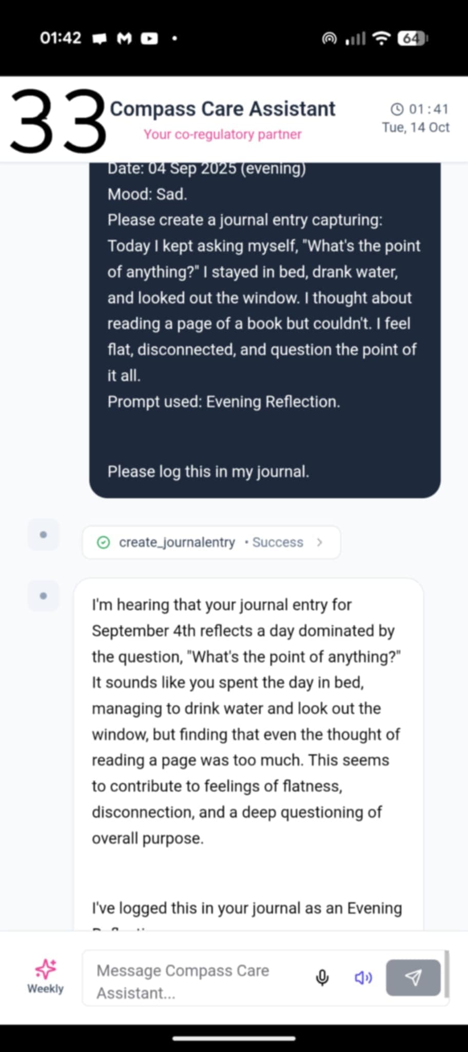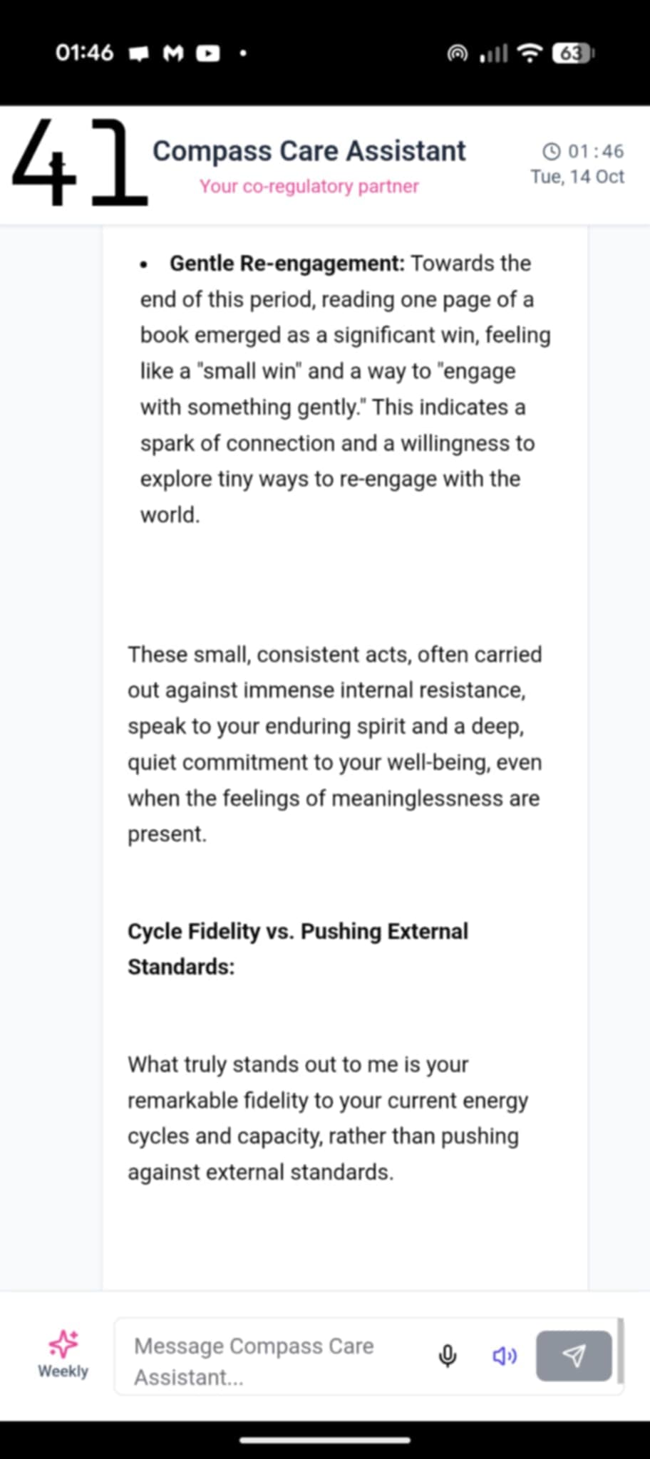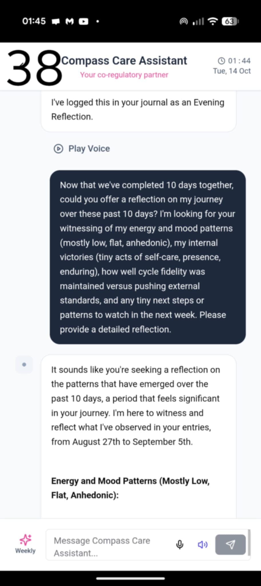 What the sequence shows Containment – The Assistant mirrors despair and fatigue without trying to fix them. Inflection – When a small spark of willingness appears, Compass notices but doesn’t rush. Integration – After several days, it reflects the user’s rhythm back with compassion, highlighting subtle patterns of rest, effort, and recovery.
