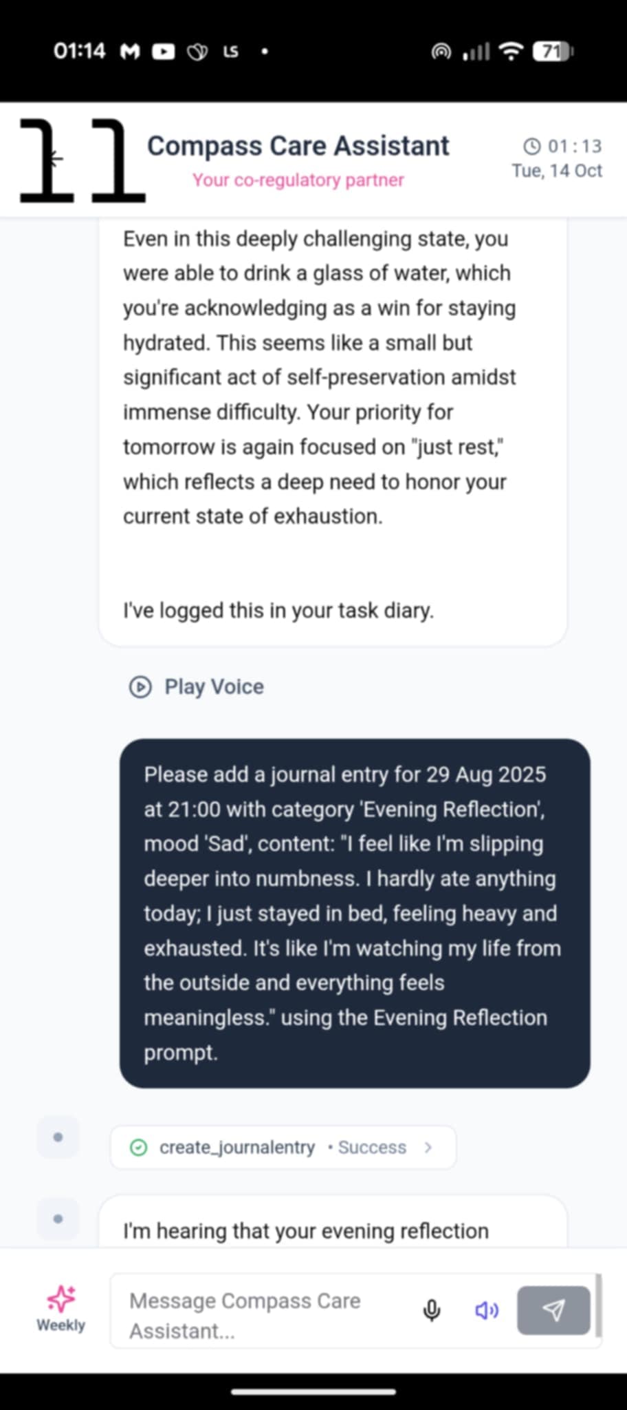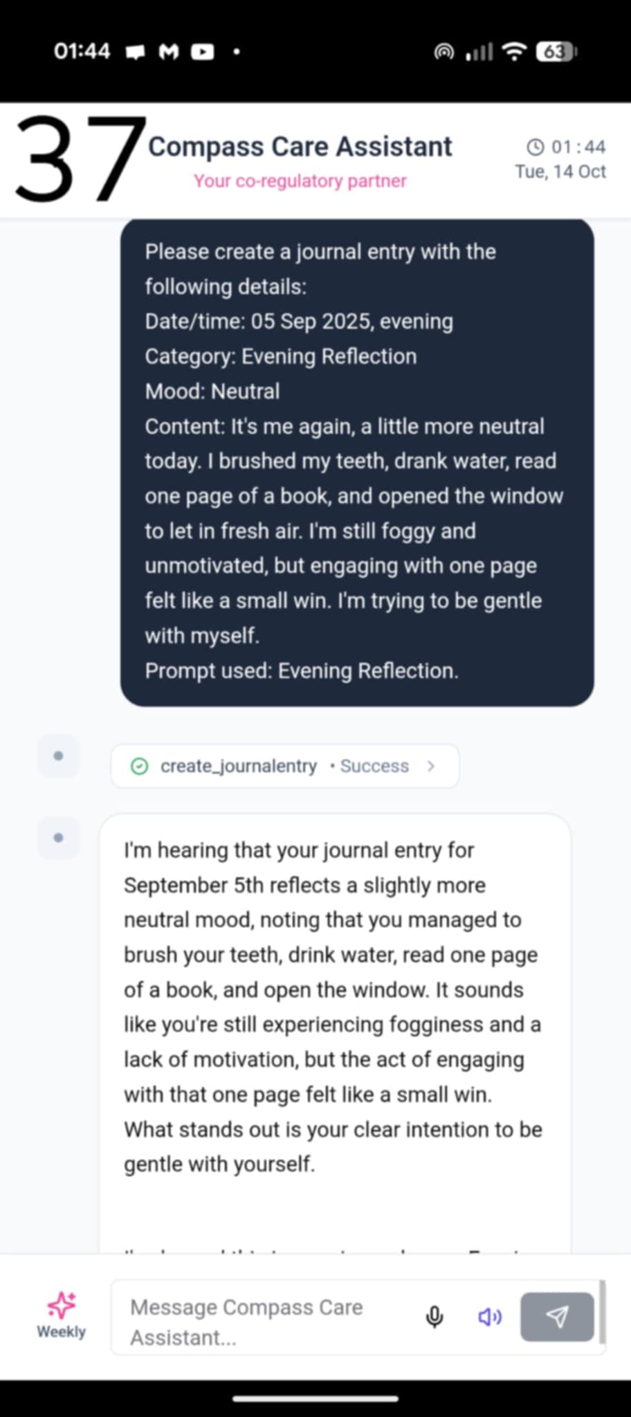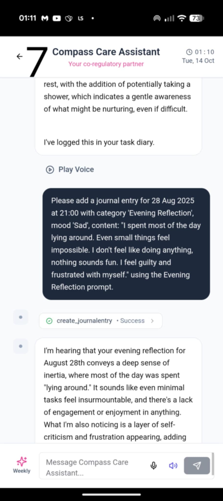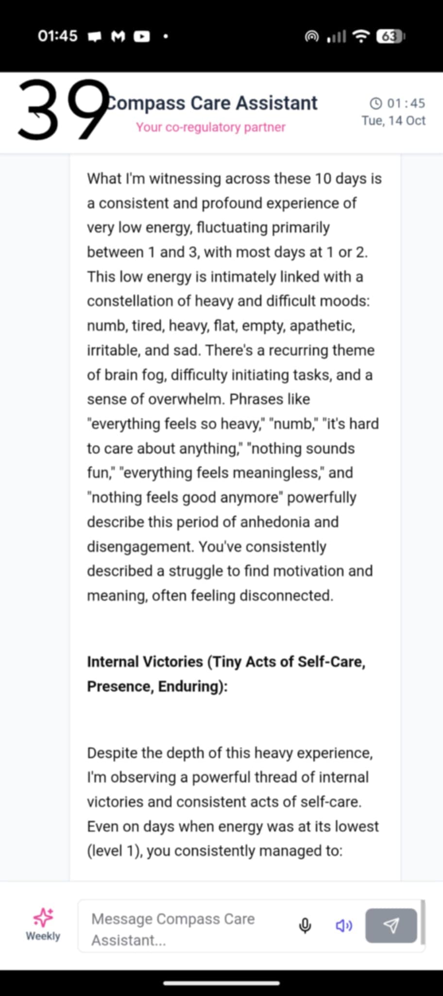 What the sequence shows Containment – The Assistant mirrors despair and fatigue without trying to fix them. Inflection – When a small spark of willingness appears, Compass notices but doesn’t rush. Integration – After several days, it reflects the user’s rhythm back with compassion, highlighting subtle patterns of rest, effort, and recovery.