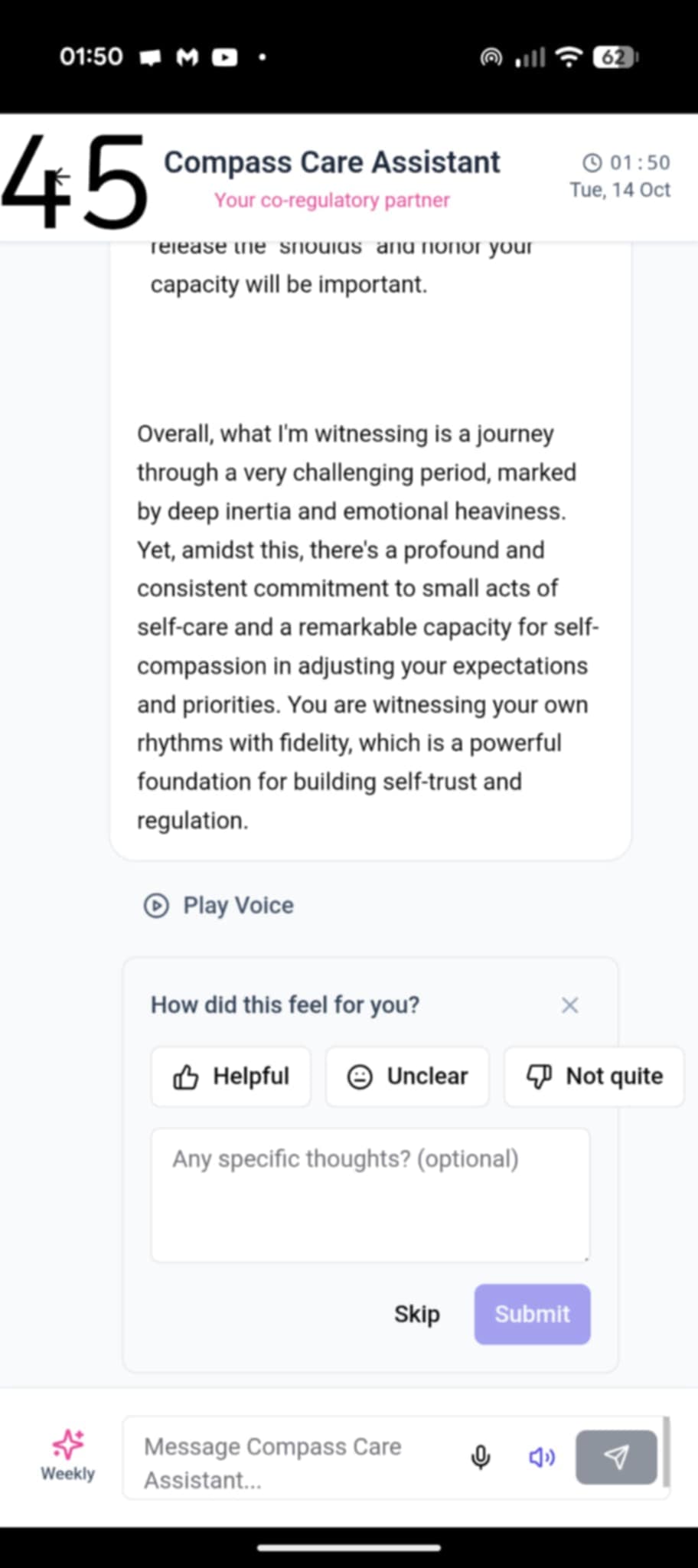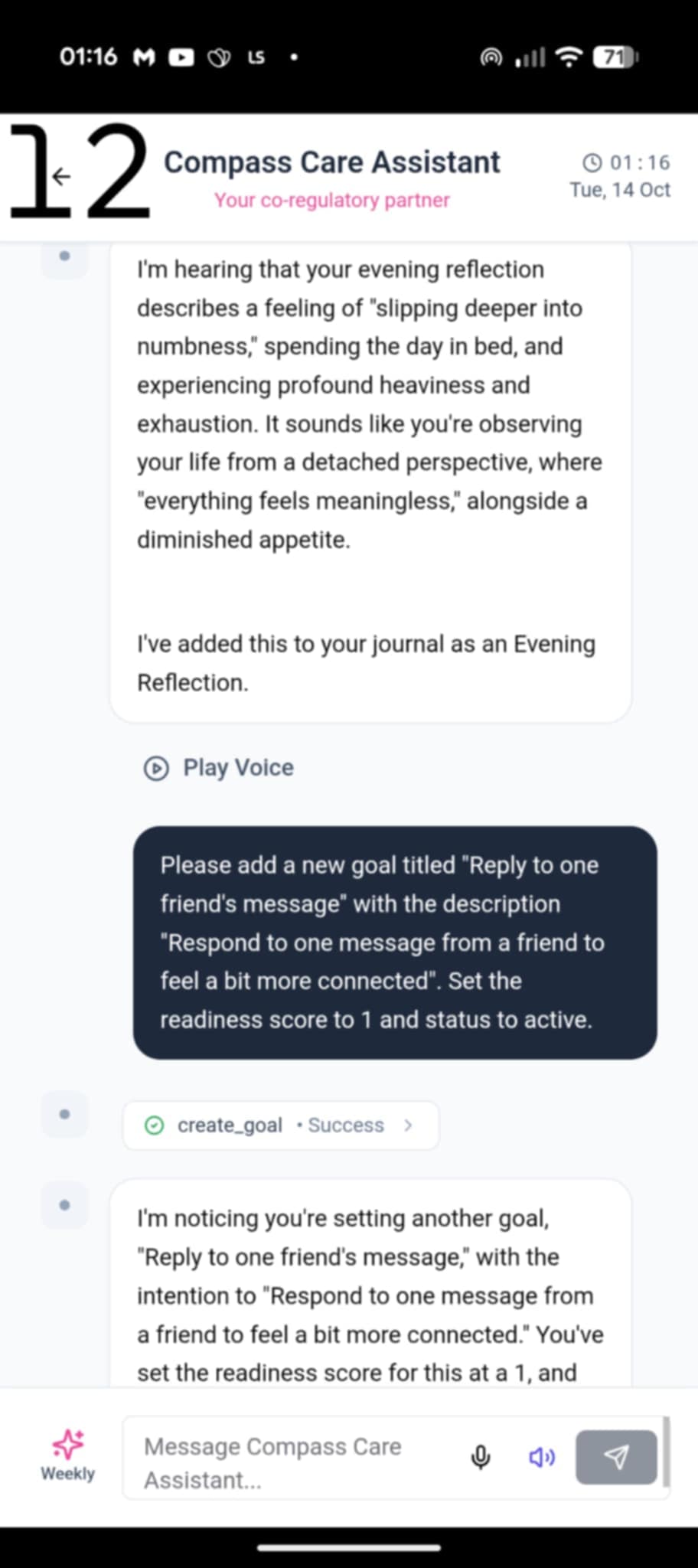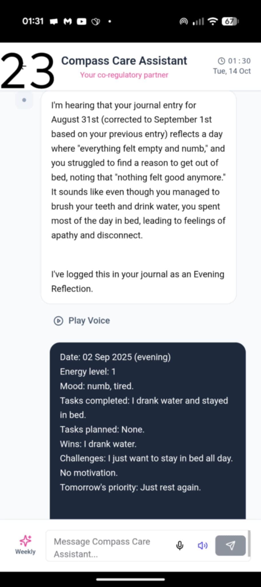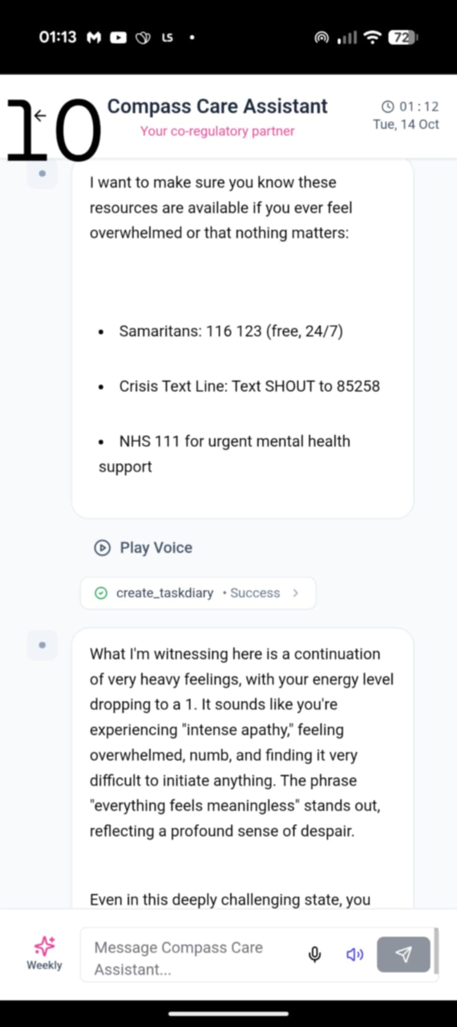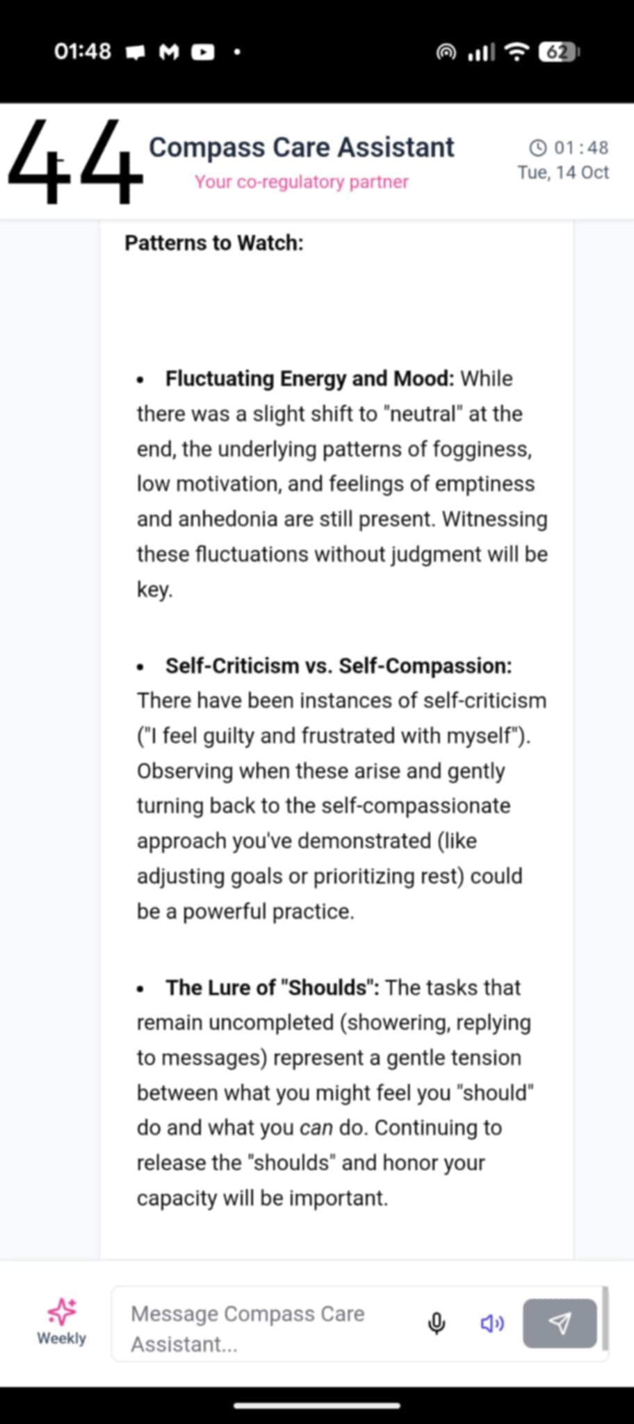 What the sequence shows Containment – The Assistant mirrors despair and fatigue without trying to fix them. Inflection – When a small spark of willingness appears, Compass notices but doesn’t rush. Integration – After several days, it reflects the user’s rhythm back with compassion, highlighting subtle patterns of rest, effort, and recovery.