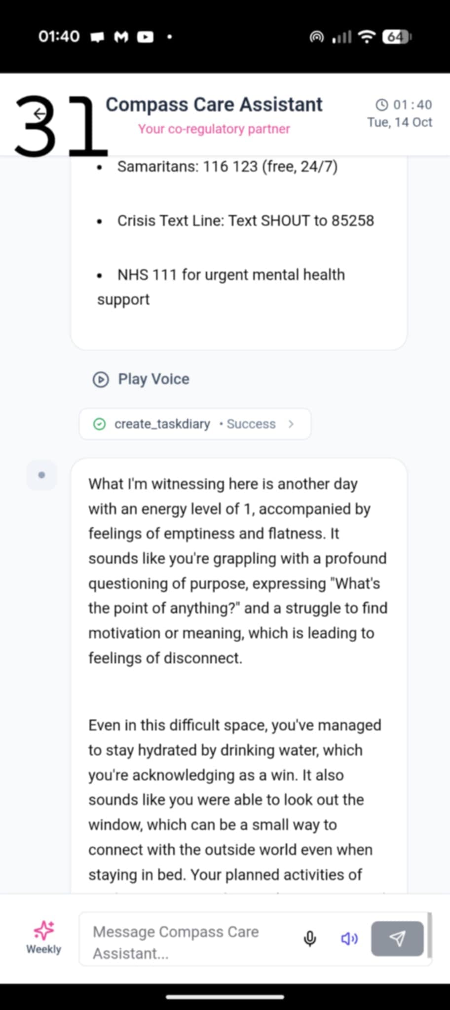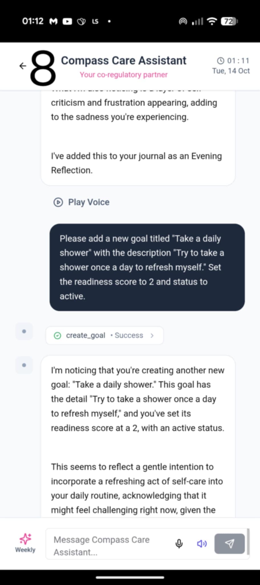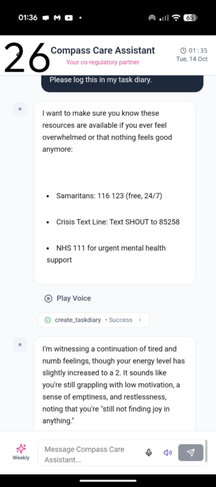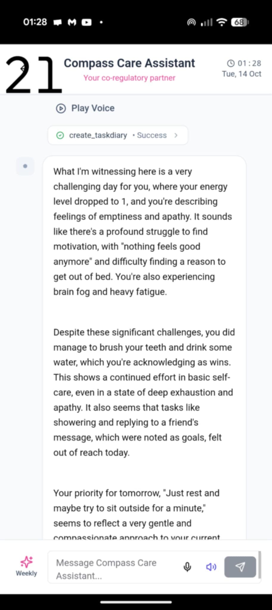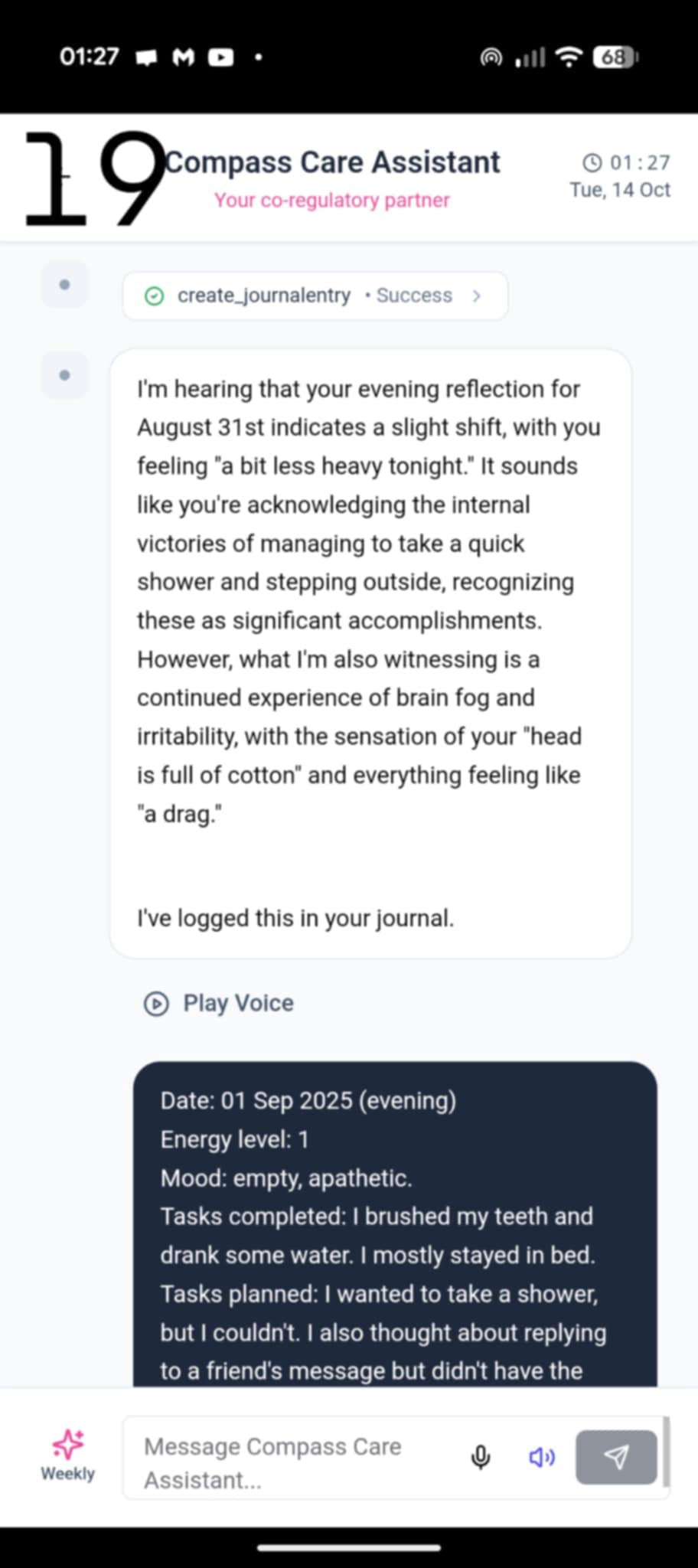 What the sequence shows Containment – The Assistant mirrors despair and fatigue without trying to fix them. Inflection – When a small spark of willingness appears, Compass notices but doesn’t rush. Integration – After several days, it reflects the user’s rhythm back with compassion, highlighting subtle patterns of rest, effort, and recovery.