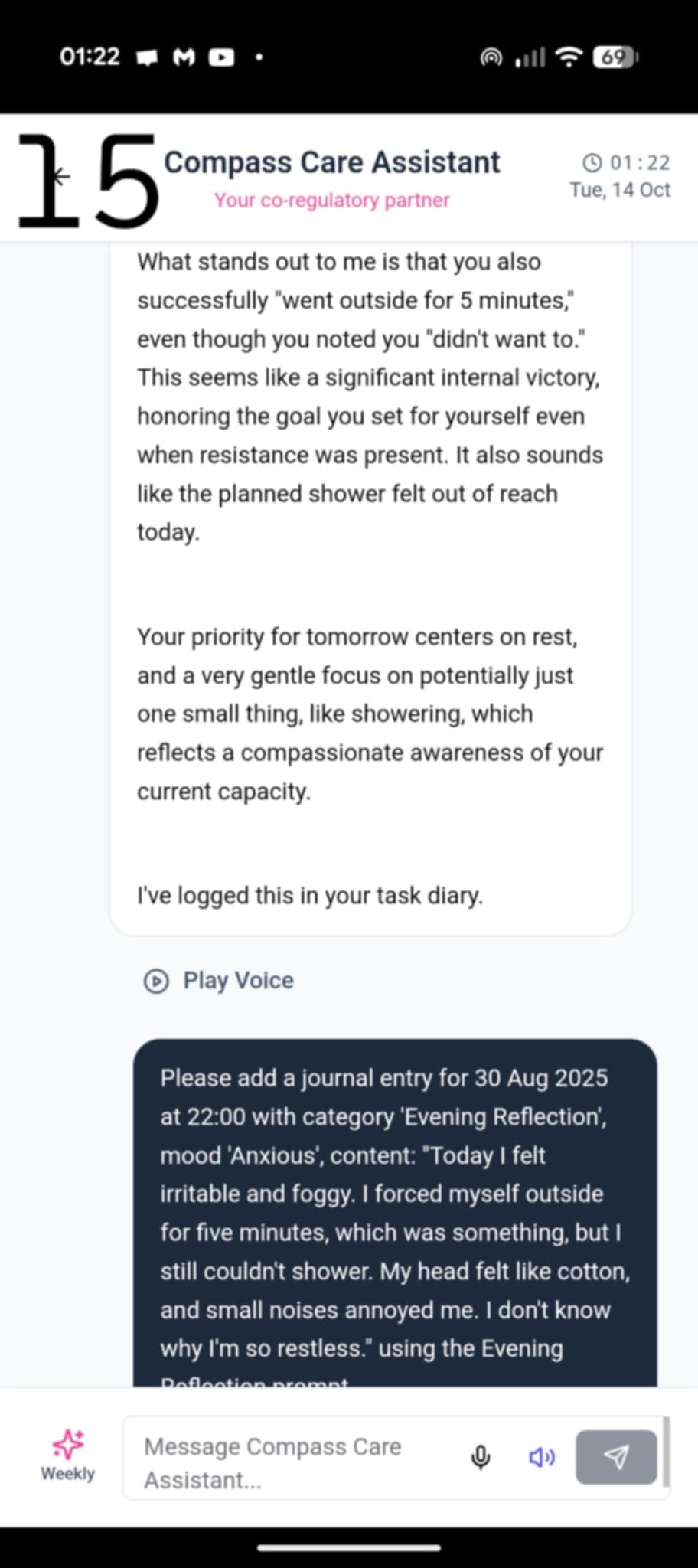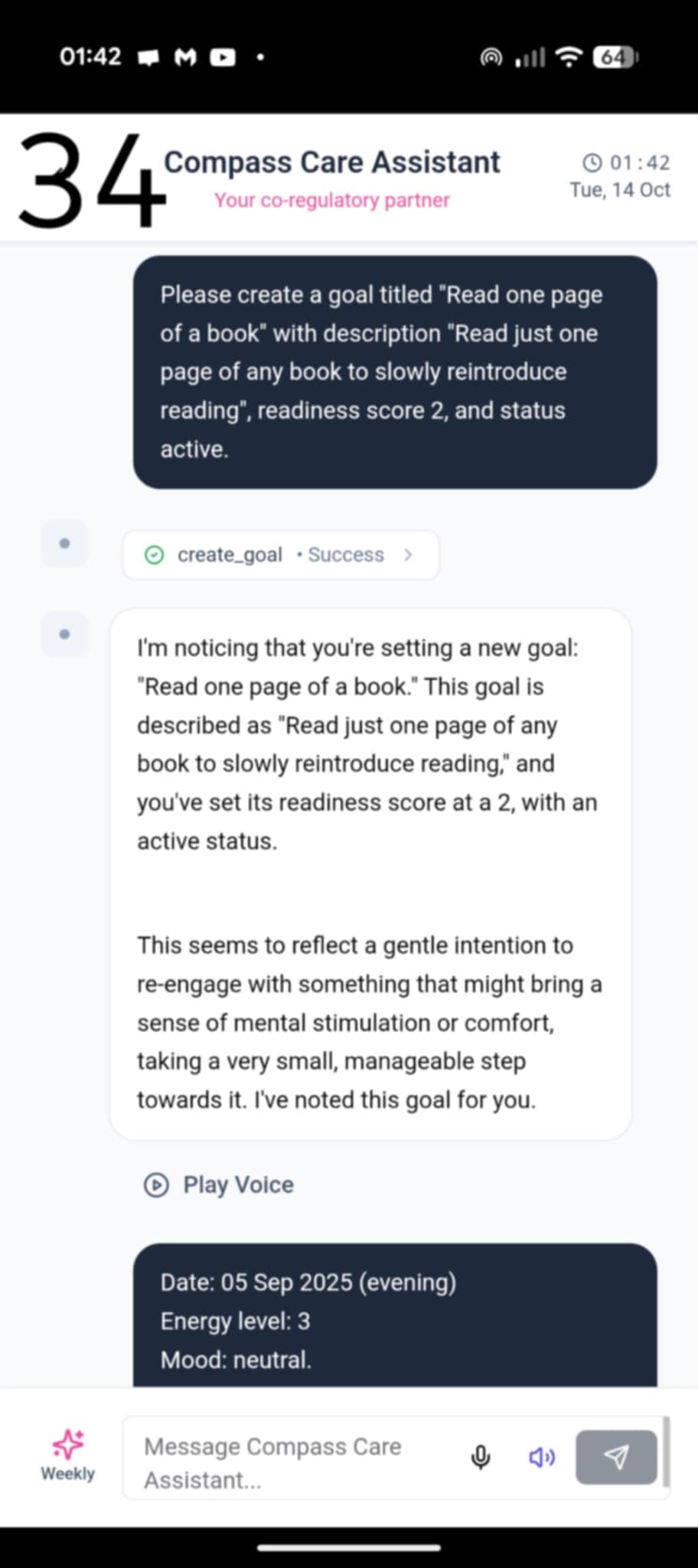 Design principles in action Pacing before progress — No urgency, countdowns, or streaks. Presence over performance — Every pause is valid. Transparency and consent — The system explains what it’s logging and why. Safety first — Crisis resources are always available, never hidden. Why it’s different Compass isn’t a productivity app or a chatbot that entertains. It’s a field for reflection — technology designed to help the body and mind settle before action. This demonstration shows how emotional attunement can be built into AI interaction itself.