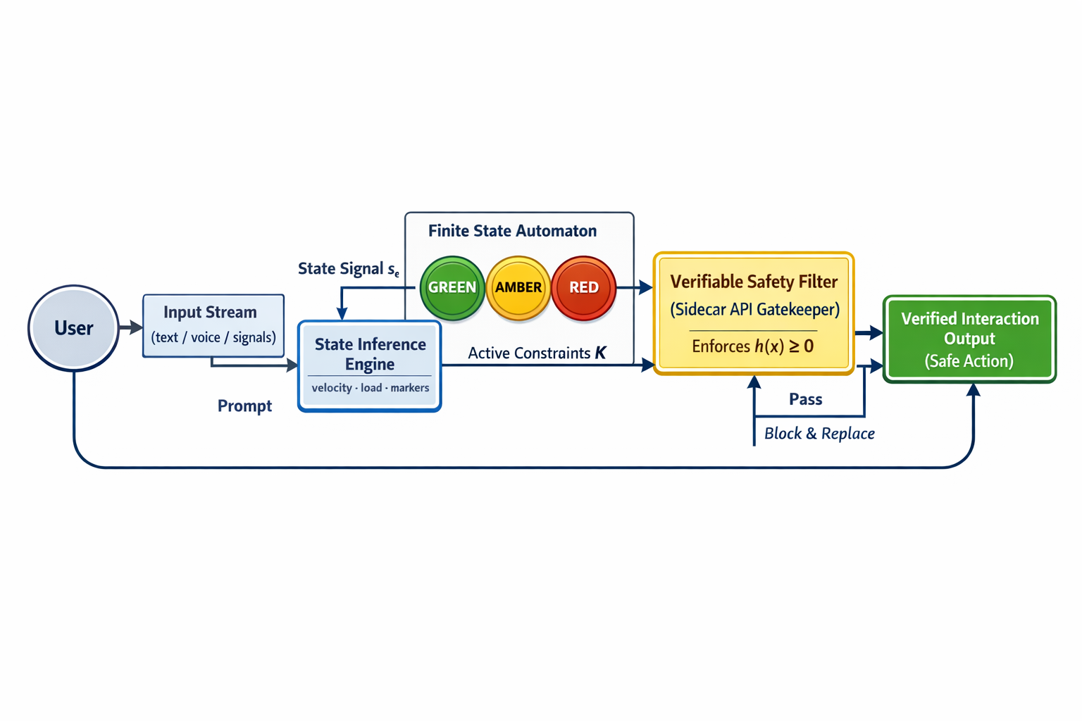 Compass Governor operates as a deterministic safety sidecar. It models human-AI interaction as a finite state system and enforces explicit runtime constraints on AI actuation. Safety is enforced independently of model alignment.